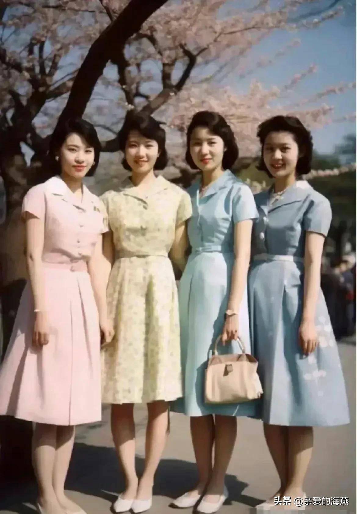这张照片拍摄于七八十年代,照片中的四位女士温婉美丽,穿着当时流行的裙子,背景是盛开的樱桃树。那个年代,穿着时尚的裙子就像一件奢侈品。当时的人们皮肤好、头发亮丽,虽然没有高档化妆品和美颜技术,但他们的自信、干净和整洁,透露出一种自然的优雅,那才是真正的美——纯粹的、无修饰的美。