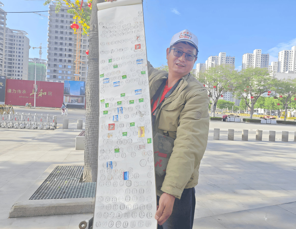 4月14日,在菏泽牡丹广场,牡丹晚报全媒体记者见到了李龙宙。他身材魁梧,背着一只硕大的旅行包,里面放着创作的书法作品、各类剪报和邮局打卡手册,浑身散发着浓浓的冒险精神和艺术气息。